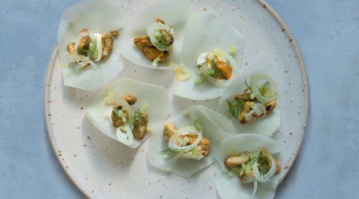 En elegant och nordisk förrätt där Limfjord-blåmusslor kombineras med rökig färskost, krispig kålrabbi och fänkål.